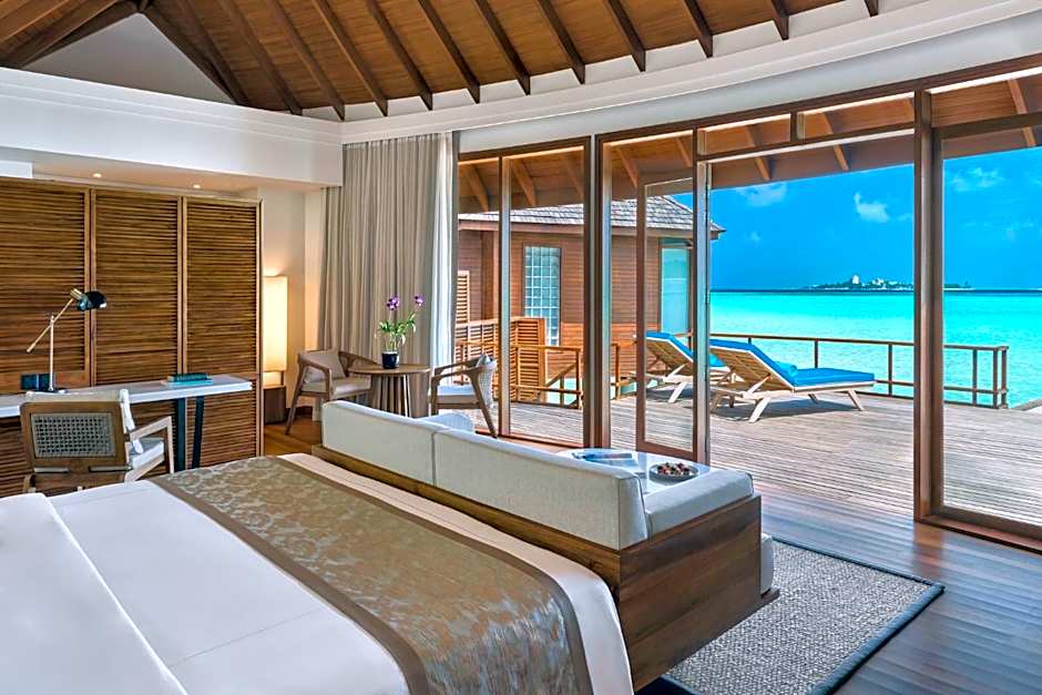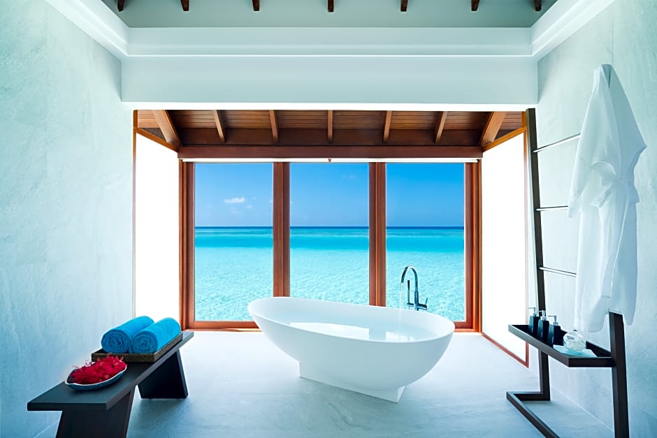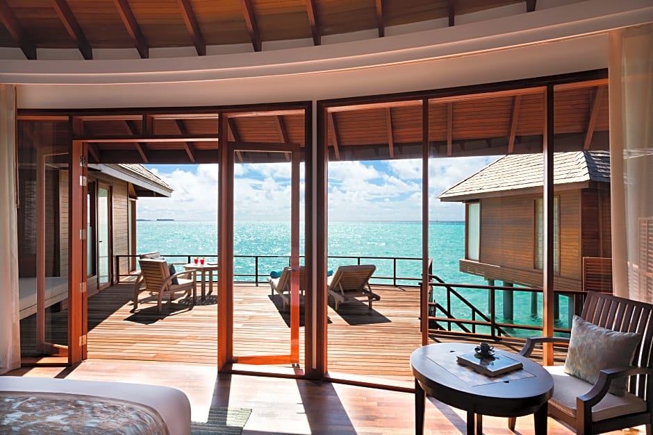 Offers sunrise views, direct lagoon access and waterfront sundeck. It has floor-to-ceiling windows, terrace with 2 loungers and a full-stocked mini-bar. The suites are equipped with a flat-screen TV and a Nespresso coffee machine. The private bathroom comes with a bathtub, rainshower and bathrobes. Infants and children are not allowed in this villa type. Life jackets are available.